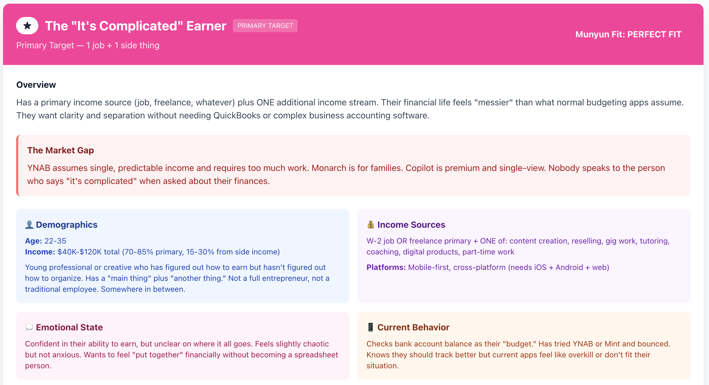And that specificity (an untapped market) is focusing on those people who work a 9-5 but also side hustles and side gigs but still want to keep both income streams separate for taxes and other reasons - but still want to view all their money at once.