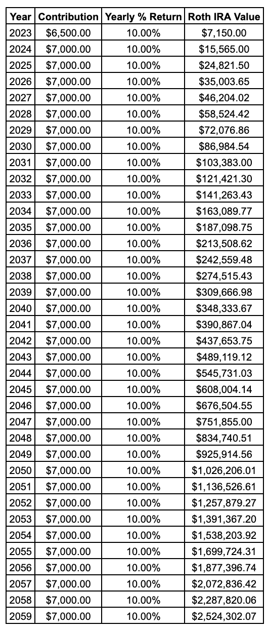 With compound interest, anyone can become a millionaire. Look at the table below, if you start funding your Roth IRA in 2023.