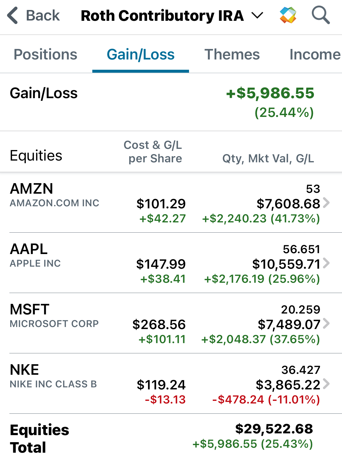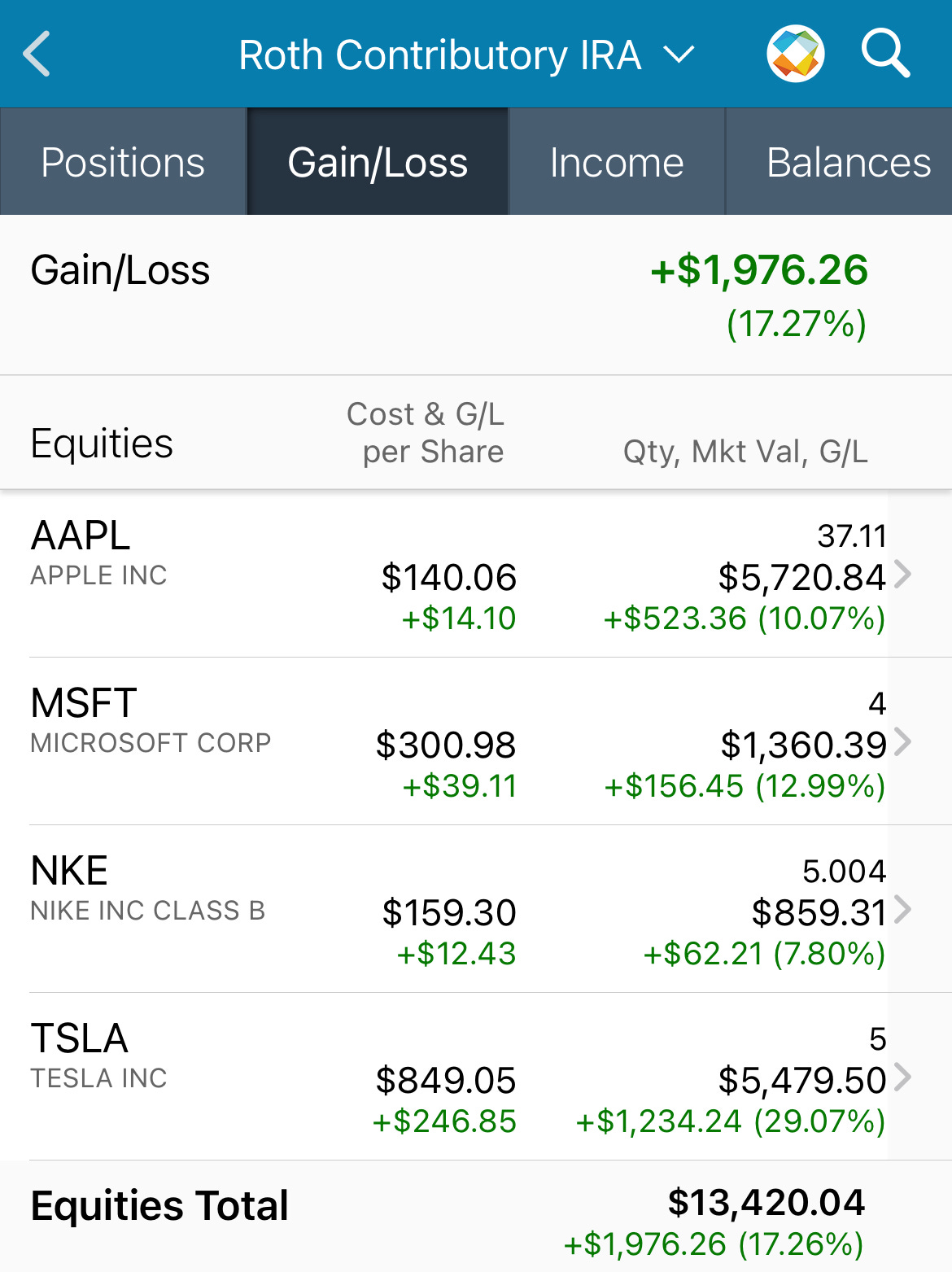 Currently, I have a Roth IRA. In 2019, I decided to start my wealth journey and open an account. A Roth IRA can be open with most banks such as Bank of America, Fidelity, Charles Schwab, and more. I decided to go with Charles Schwab because they are known for their great customer service. Since I had money invested in an individual brokerage account, I transferred $6,000 to my Roth IRA for 2020 and then made another full contribution in 2021. So far, I was able to receive a 17% return which increased my portfolio by $1,976.26.³ While it may not seem like a lot, the important part is that I was able to get a return above 10%.