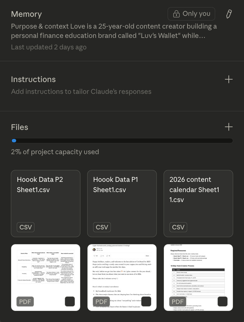 Below is a screenshot of the contextual data that I give Claude to assist me with creating short form content. As you will see I gave Claude PDF about storytelling, script writing, and even excel sheets about top performing videos.